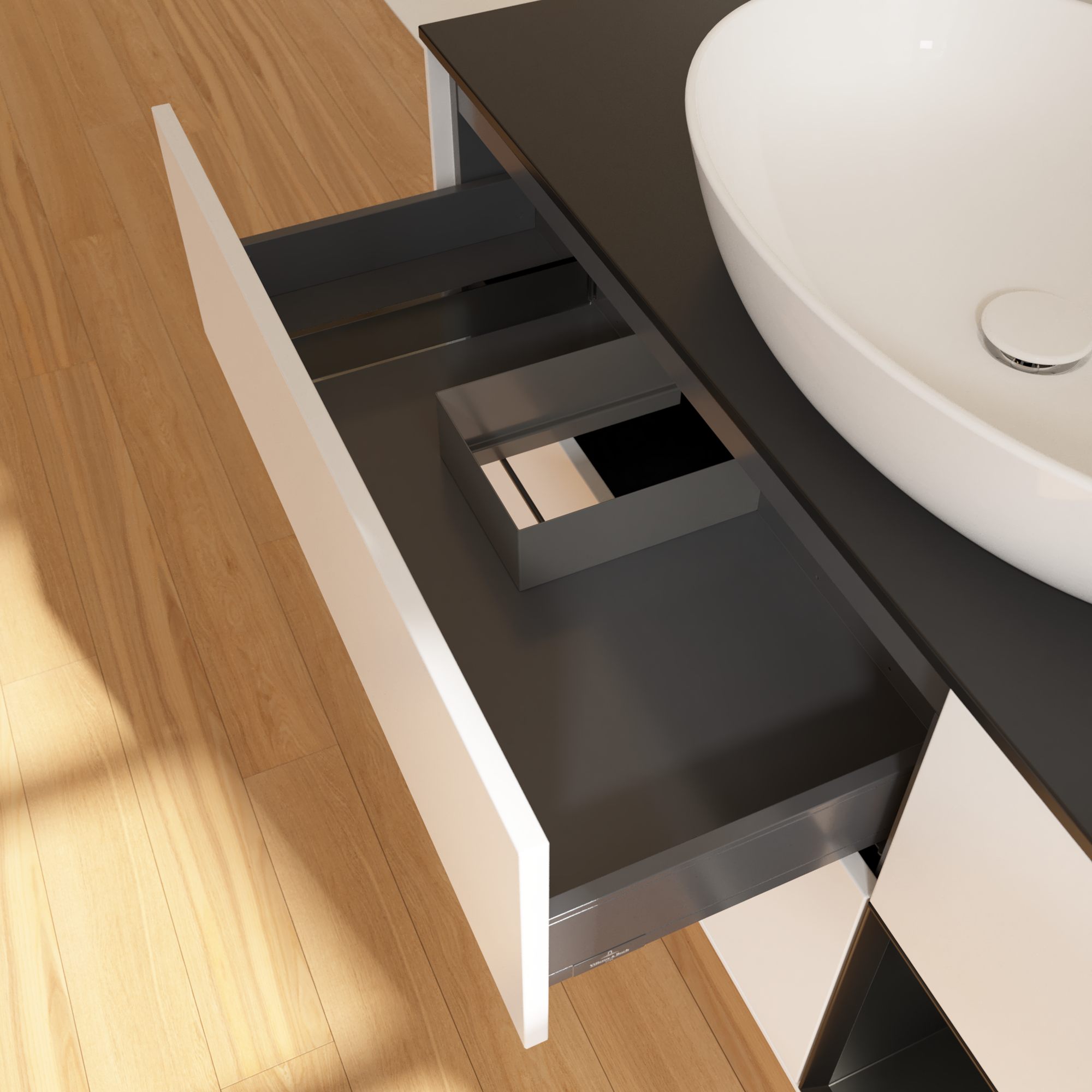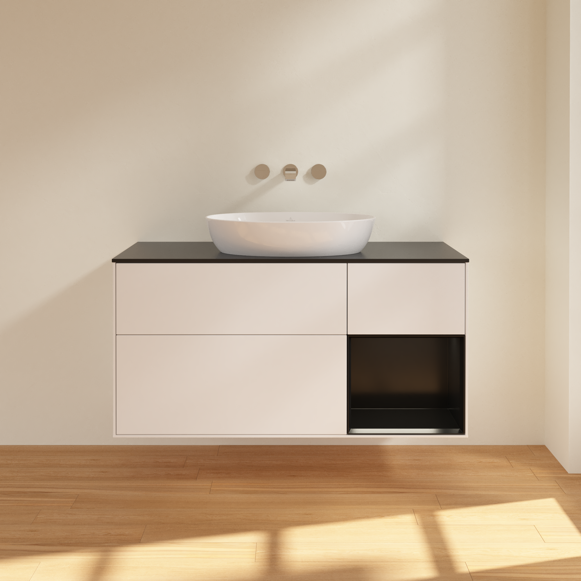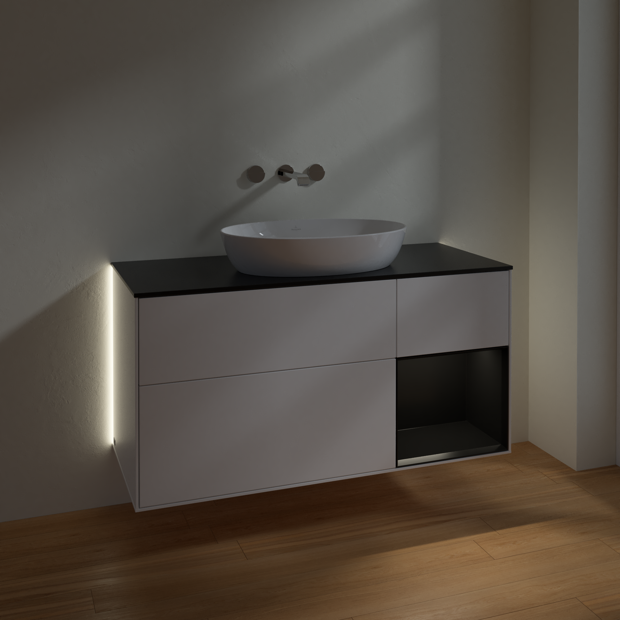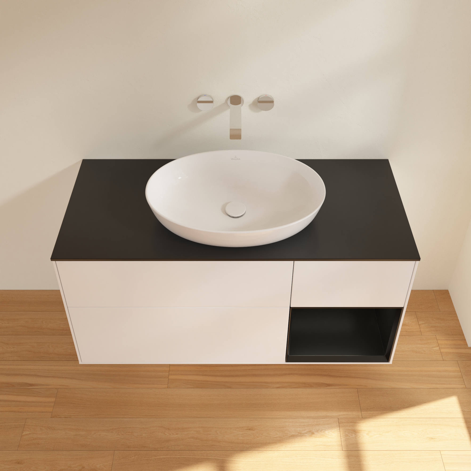 Finion Meuble sous plan, avec éclairage, 3 tiroirs sur rails, 1200x603x501mm, Caisson: White Matt Lacquer, Façade: White Matt Lacquer, Élément d’étagère: Black Matt Lacquer, Plaque de recouvrement: Glass Black Matt