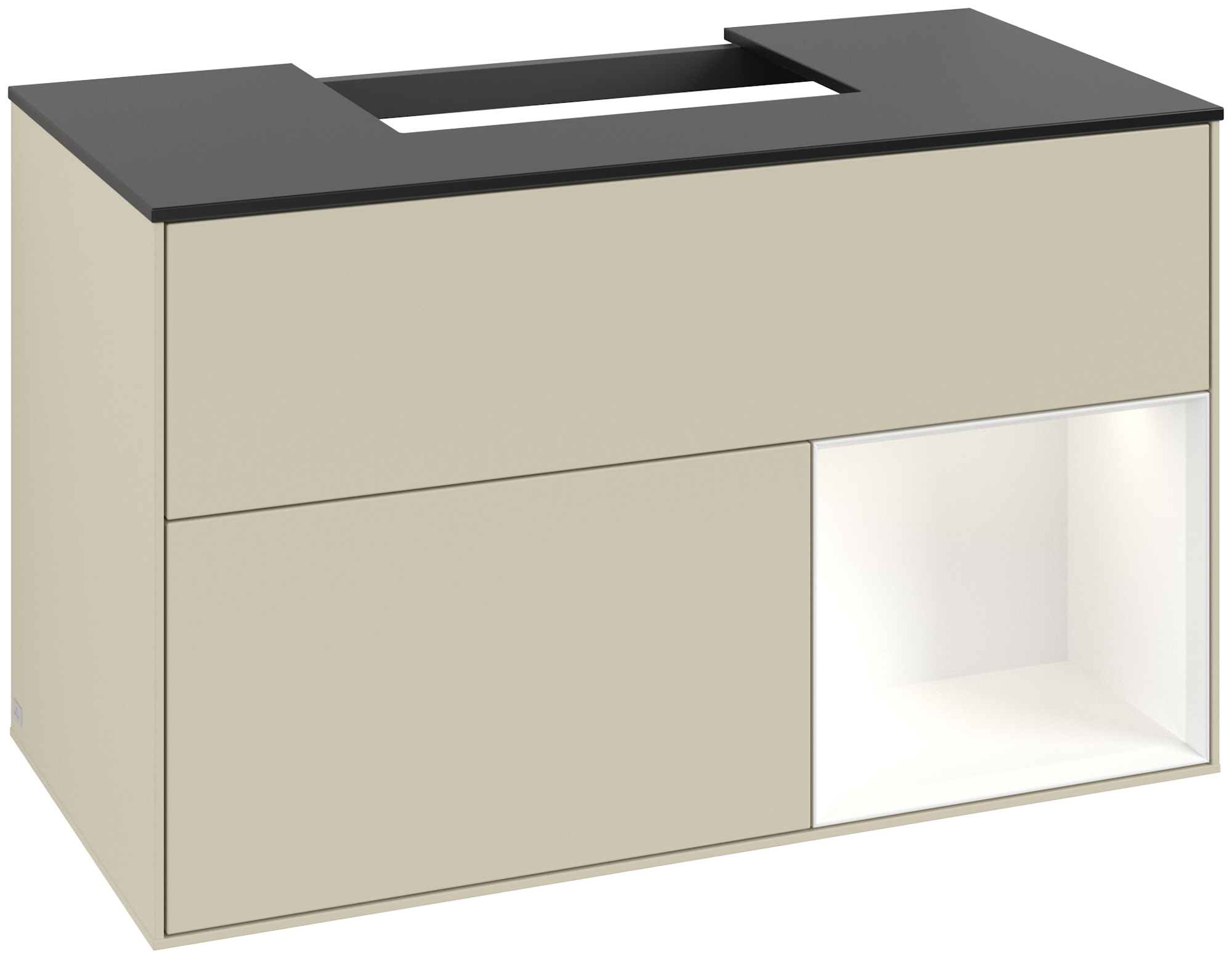 Finion Meuble sous plan, avec éclairage, 2 tiroirs sur rails, 1000x603x501mm, Caisson: Silk Grey Matt Lacquer, Façade: Silk Grey Matt Lacquer, Élément d’étagère: White Matt Lacquer, Plaque de recouvrement: Glass Black Matt