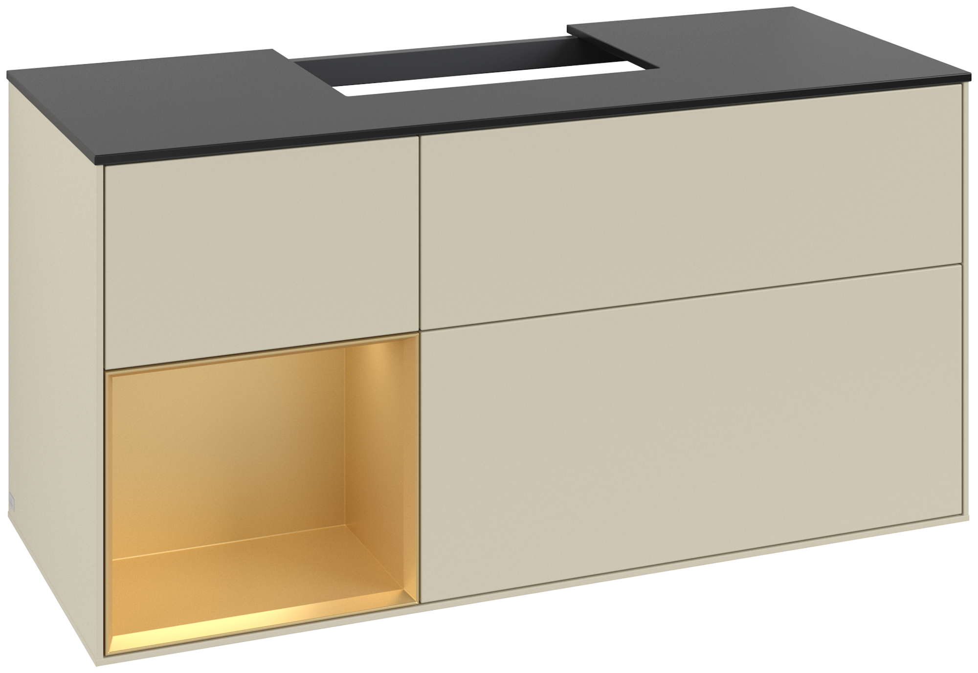 Finion Meuble sous plan, avec éclairage, 3 tiroirs sur rails, 1200x603x501mm, Caisson: Silk Grey Matt Lacquer, Façade: Silk Grey Matt Lacquer, Élément d’étagère: Gold Matt Lacquer, Plaque de recouvrement: Glass Black Matt