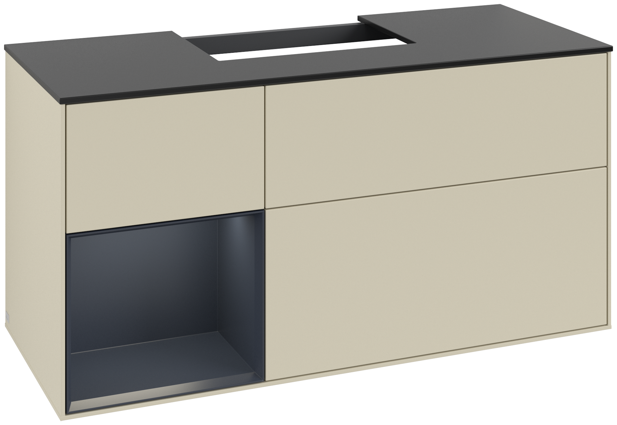 Finion Meuble sous plan, avec éclairage, 3 tiroirs sur rails, 1200x603x501mm, Caisson: Silk Grey Matt Lacquer, Façade: Silk Grey Matt Lacquer, Élément d’étagère: Midnight Blue Matt Lacquer, Plaque de recouvrement: Glass Black Matt