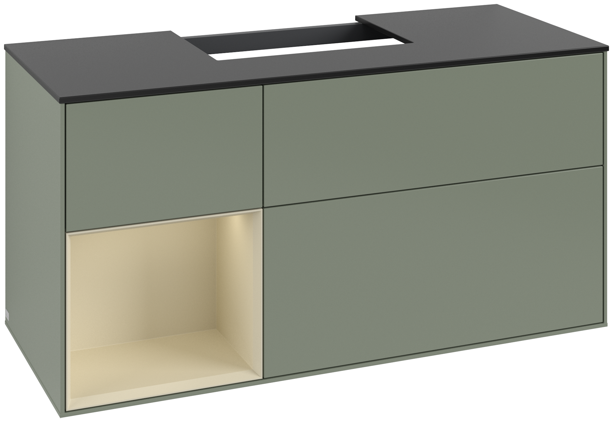 Finion Meuble sous plan, avec éclairage, 3 tiroirs sur rails, 1200x603x501mm, Caisson: Olive Matt Lacquer, Façade: Olive Matt Lacquer, Élément d’étagère: Silk Grey Matt Lacquer, Plaque de recouvrement: Glass Black Matt