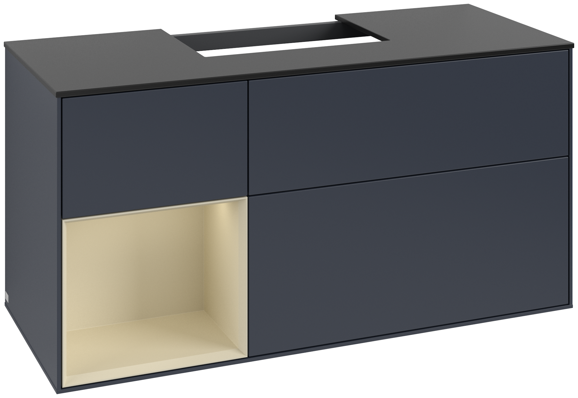 Finion Meuble sous plan, avec éclairage, 3 tiroirs sur rails, 1200x603x501mm, Caisson: Midnight Blue Matt Lacquer, Façade: Midnight Blue Matt Lacquer, Élément d’étagère: Silk Grey Matt Lacquer, Plaque de recouvrement: Glass Black Matt