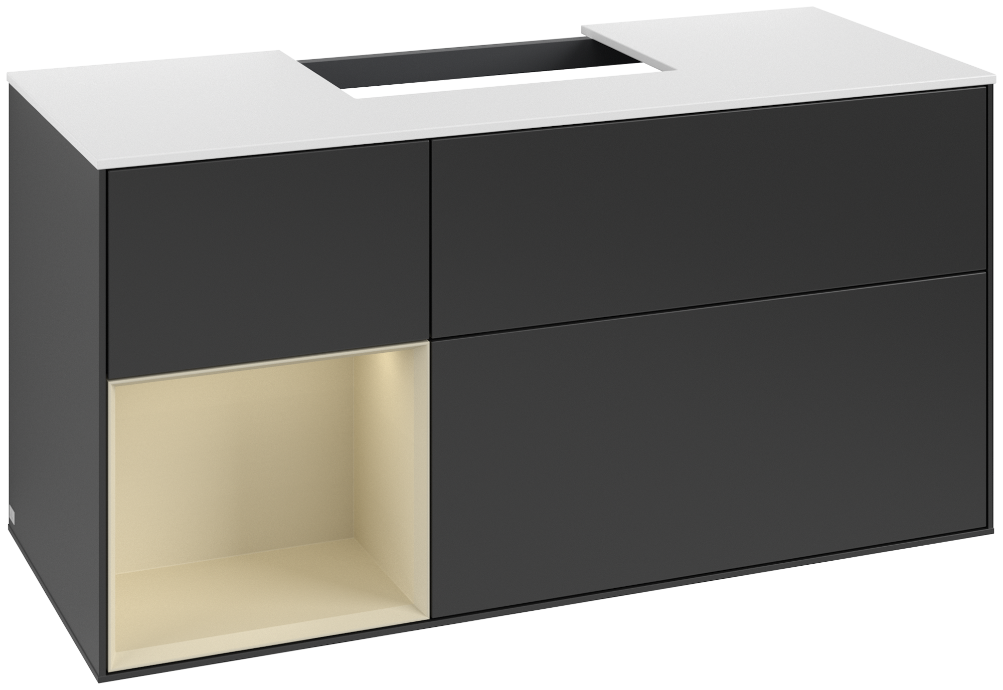 Finion Meuble sous plan, avec éclairage, 3 tiroirs sur rails, 1200x603x501mm, Caisson: Black Matt Lacquer, Façade: Black Matt Lacquer, Élément d’étagère: Silk Grey Matt Lacquer, Plaque de recouvrement: Glass White Matt