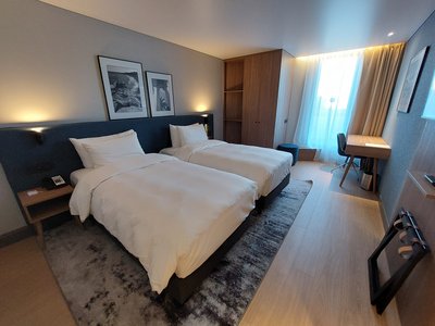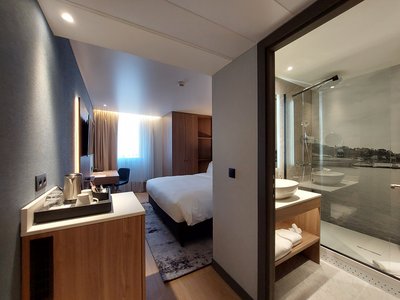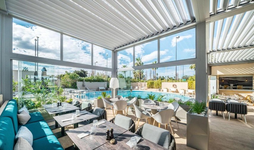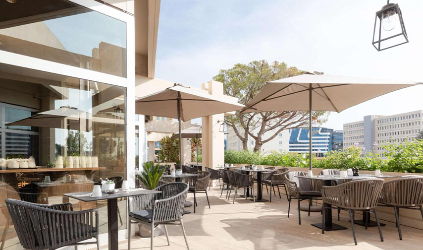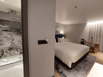 Dans tout l’intérieur de l’hôtel, le concept chromatique méditerranéen est associé à un aménagement épuré, à l’allure scandinave, ce qui crée une atmosphère agréable dans le hall d’entrée, le restaurant, le bar, jusque dans les chambres et les salles de bains. Le design intérieur des chambres allie des sols, des armoires et des tables modernes en bois clair avec des stores au tombé souple en beige doux et des lits et des sièges en bleu intense ou en gris raffiné.
