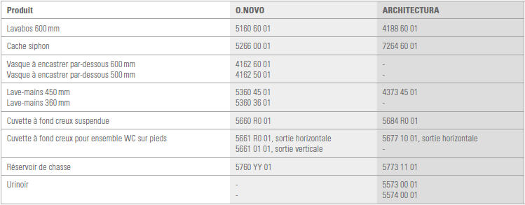 La garantie de réassortiment de 10 ans s’applique aux produits suivants* des séries O.novo et Architectura, coloris blanc :
