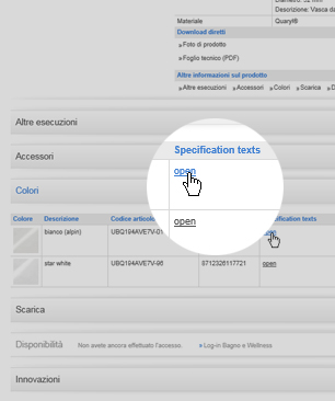 3APERTURA TESTO CAPITOLATO Nella pagina dei dettagli del prodotto aprite ora la scheda "Colori e testi per capitolato" e fate clic su "open" sotto il testo per capitolato.