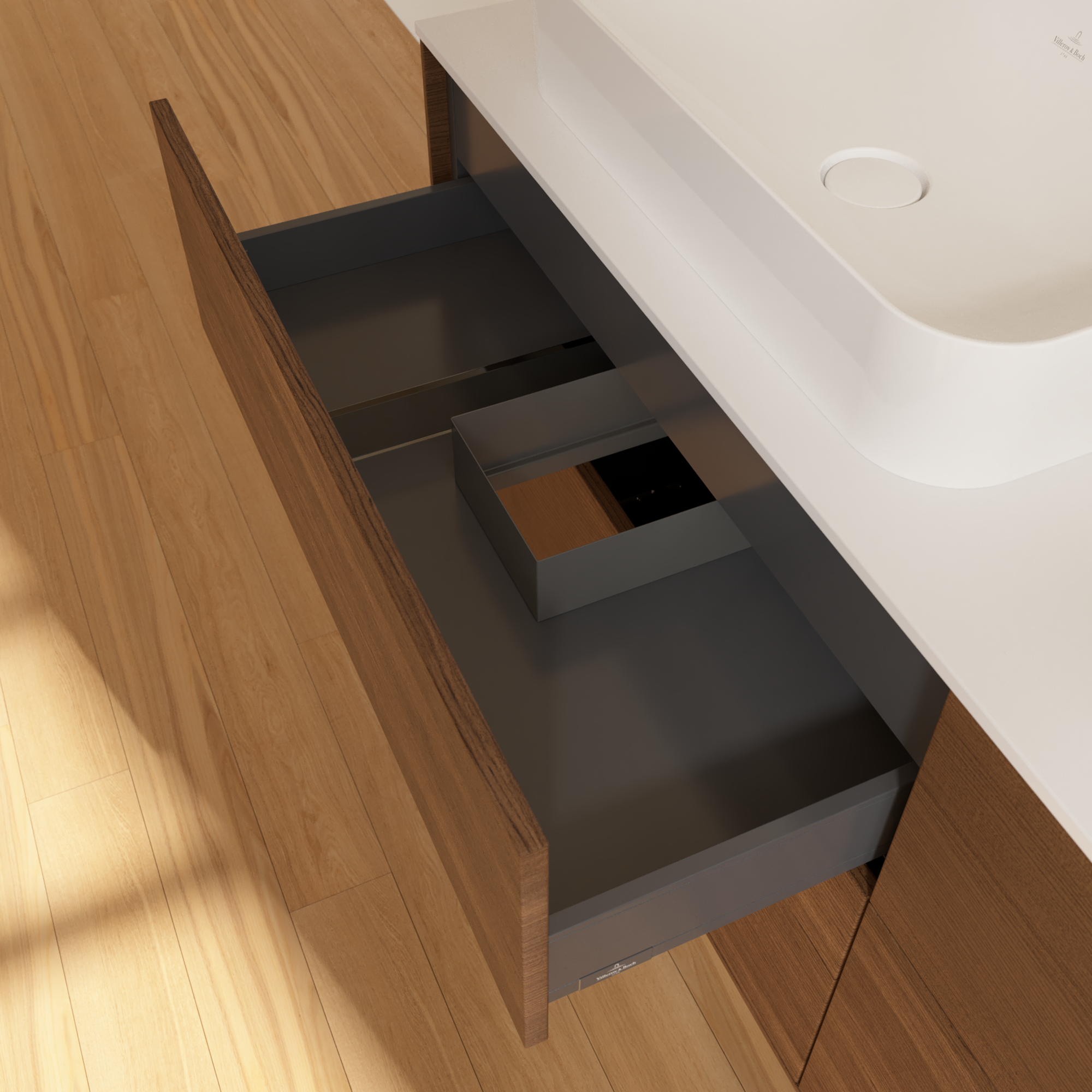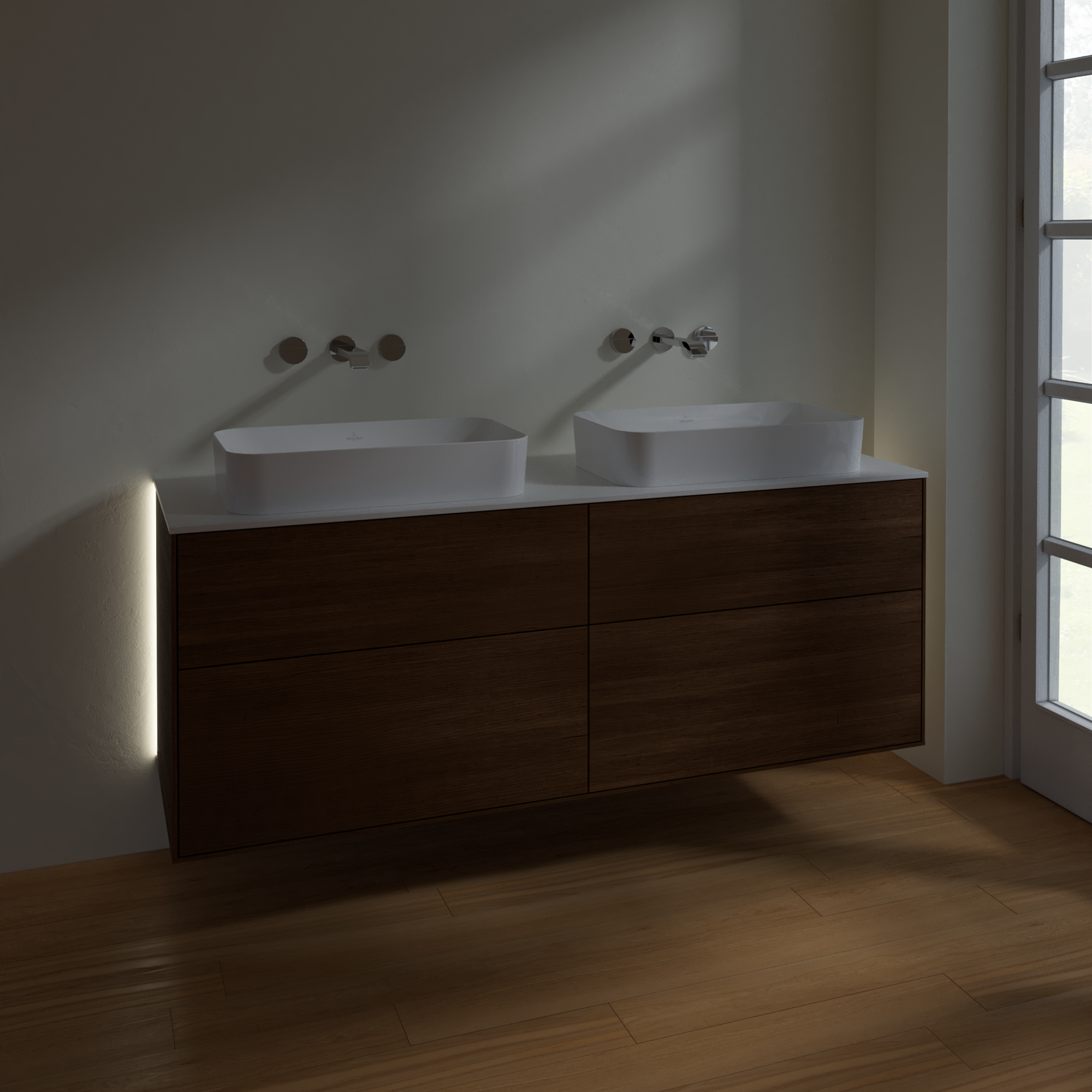 Finion Mobile sottolavabo, con illuminazione, 4 vani estraibili, 1600x603x501mm, Corpo: Walnut Veneer, Fronte: Walnut Veneer, Piastra di copertura: Glass White Matt