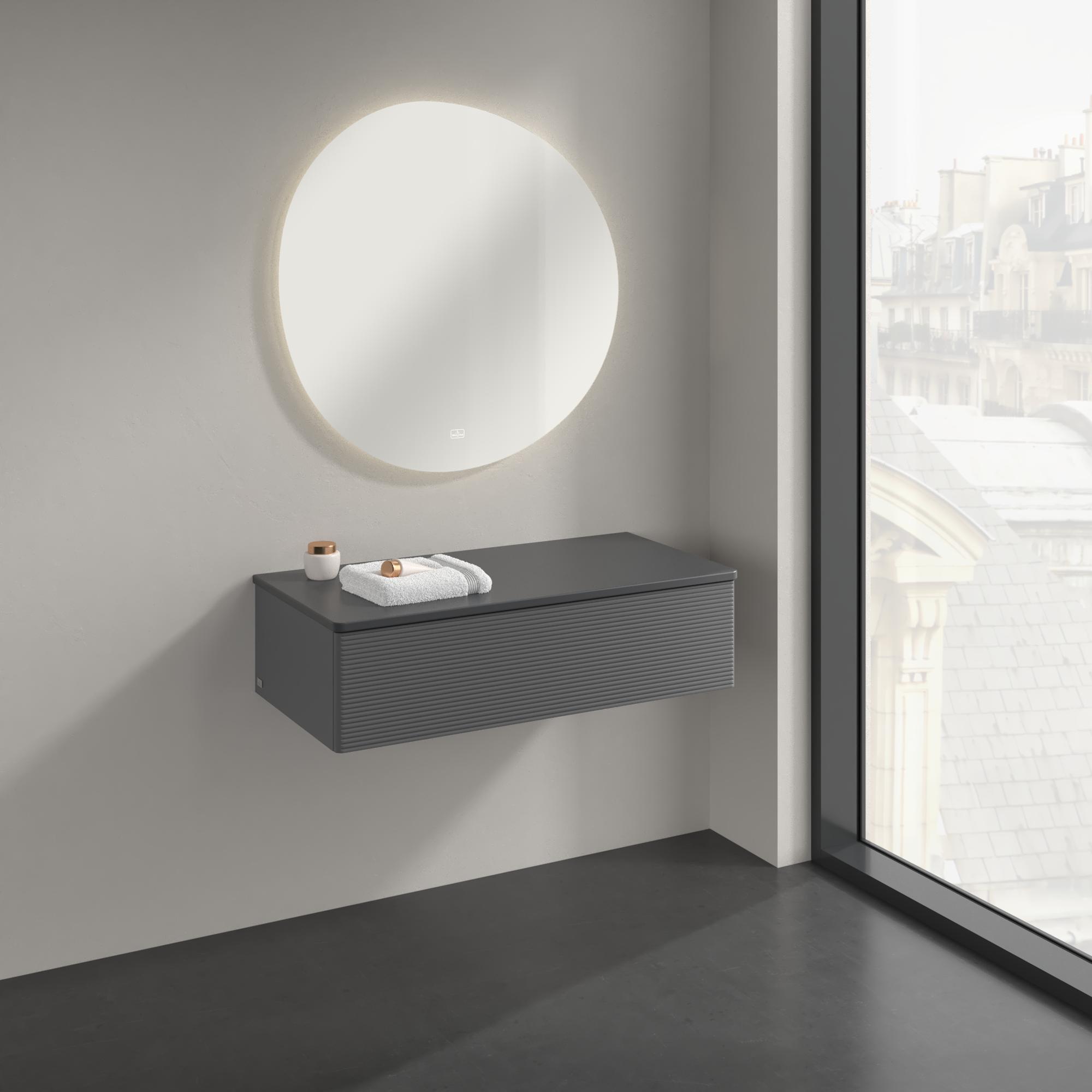 Antao Armadio laterale, 1 vano estraibile, 1000x268x500mm, Frontale con texture, Corpo: Anthracite Matt Lacquer, Fronte: Anthracite Matt Lacquer, Piastra di copertura: Botticino