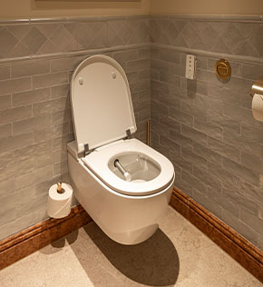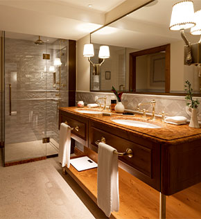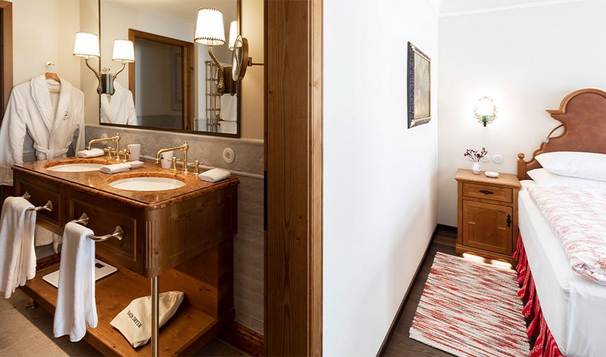 De badkamers van de kamers zijn ingericht met Villeroy & Boch sanitairkeramiek: Een tijdloos elegante indruk maakt de ovale onderbouwwastafel van de collectie Evana samen met het wastafelblad van rood Adneter-marmer, dat al eeuwenlang in Salzburg wordt gewonnen en op veel plaatsen en gebouwen in de oude stad te vinden is. Elke kamer is voorzien van de douche-wc ViClean-I 100 die bij toiletbezoek een grondige reiniging mogelijk maakt die de huid ontziet. De gast kiest heel eenvoudig de verschillende douchefuncties met de afstandsbediening. Als individueel element, speciaal de de Goldener Hirsch, is de toiletzitting fraai voorzien van het logo van het huis. De badkamers in het algemene hotelgedeelte werden uitgerust met de nieuwe spoelrandloze wc-generatie van de Subway 2.0 collectie en met urinoirs uit de Architectura-serie van Villeroy & Boch. |
