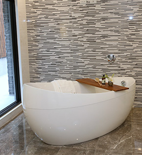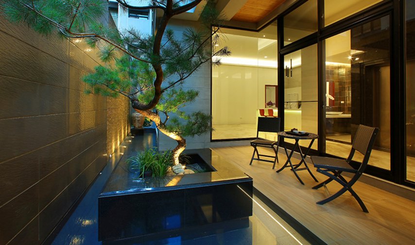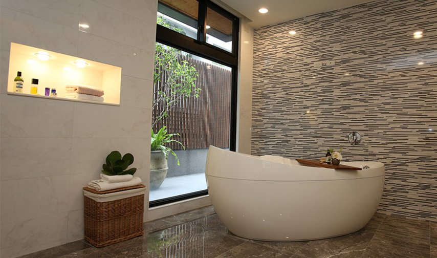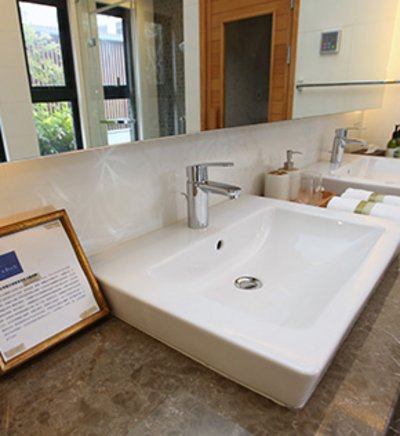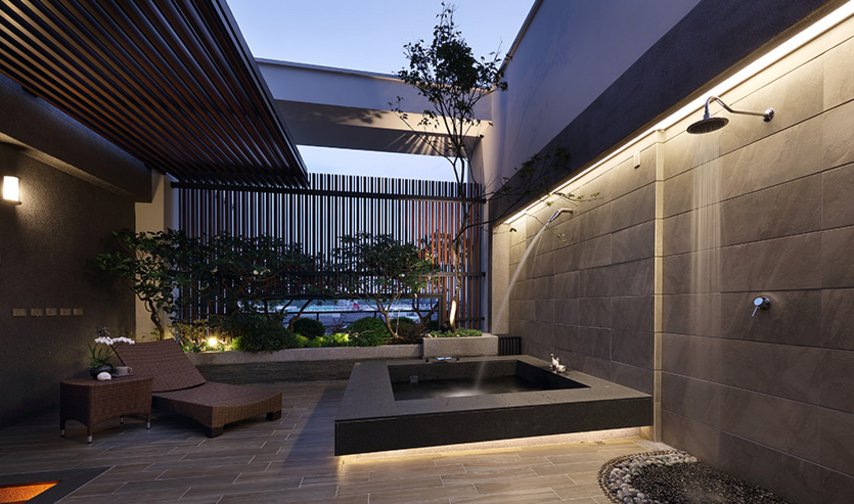 Tuinarchitectuur op zowel de hoge als lage niveaus zorgt voor een rijke complexiteit en verweving van de binnen- en buitenruimtes. De ruimtes lopen visueel van binnen naar buiten, met waterelementen ertussen die schaduwen van de ene ruimte naar de andere werpen. Deze vervaging van ruimtes werkt niet alleen subtiel en intrigerend, maar zorgt ook voor privacy. De natuurlijke elementen in combinatie met dit gevoel van privacy resulteren in een kalme en vredige privésfeer, waarin zowel het lichaam als de geest nieuwe energie kunnen opdoen. Deze ruimtes voor herstel en ontspanning worden aangevuld met minimalistische producten van Villeroy & Boch. Hierbij gaat het om toiletten, urinoirs en wastafels van de collecties O.Novo en Subway, plus prachtige Aveo vrijstaande baden om in te ontspannen. Het resultaat is helemaal zen.