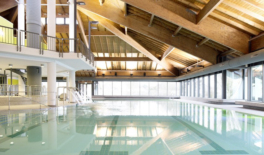 Auch der Schwimmbadbereich wurde in ein neues Gewand gehüllt; dazu haben sich die Architekten für die Serie PRO ARCHITECTURA - das vielfältige und umfassende keramische Farb- und Formatsystem von Villeroy & Boch Fliesen - entschieden. Universell einsetzbar – Modularität, Farbvielfalt und Rutschhemmung sind Kriterien, die die Serie für den Einsatz in der modernen Architektur und im Objektbereich auszeichnen. Die beiden Schwimmbecken bilden ebenfalls Farbbausteine im gesamten Raumgefüge, das große 25 m-Becken ist in gleichmäßigen hellblau Tönen gehalten und das Kinderbecken in einem Spiel aus Gelb, Grün und Blau, ein Pixelbild aus insgesamt sechs Farbnuancen.