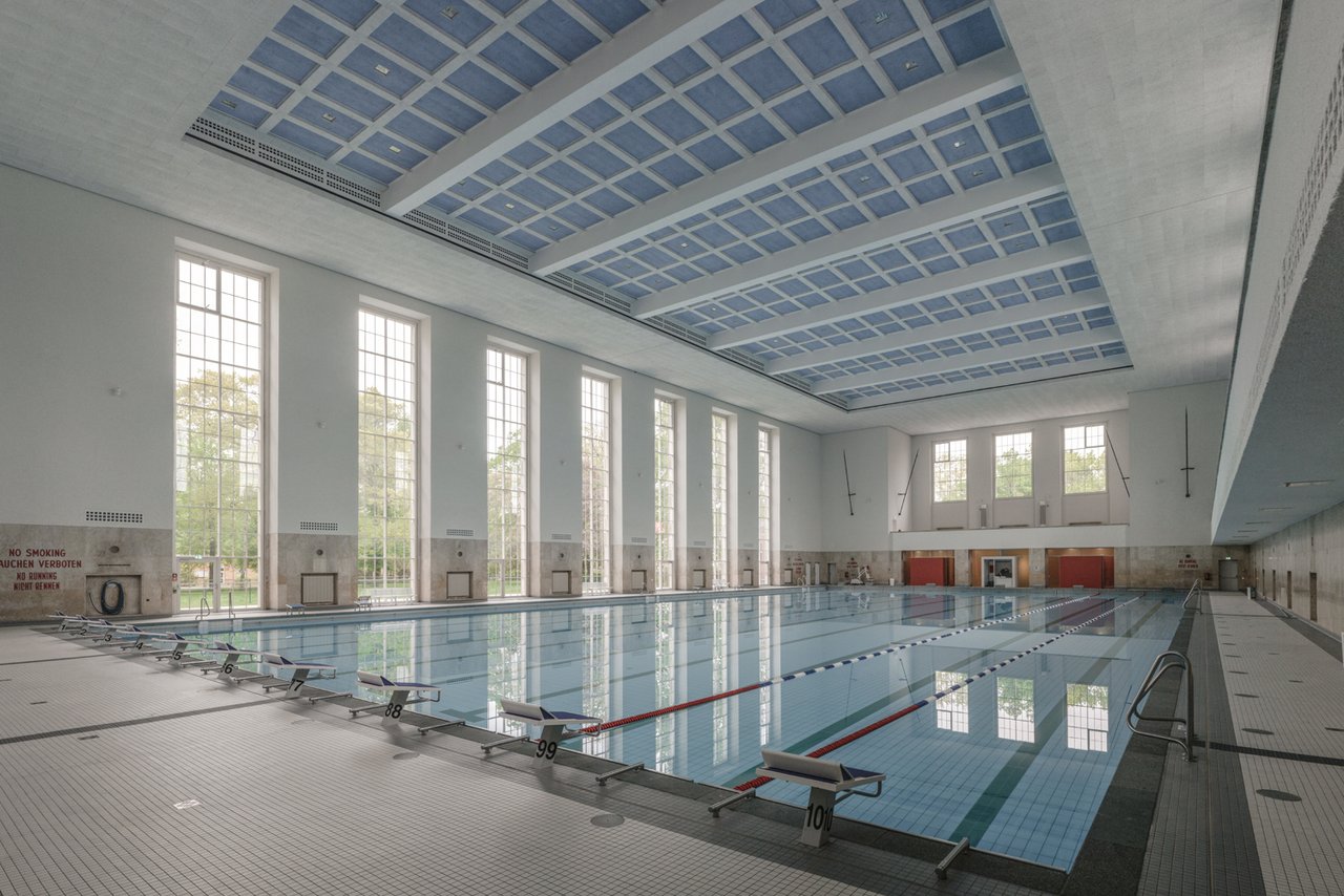 Maar voor het zover was werd het gebouw, met zijn mengvorm van klassiek-moderne en nationaal-socialistische architectuur, ingrijpend gerenoveerd, waarbij rekening is gehouden met de tegenwoordige technische en energetische vereisten en met de door Monumentenzorg opgelegde strenge beperkingen; het zwembad is volledig barrièrevrij geworden. Terwijl de oude oppervlakken in de zwemhal, de zuilengang en de trappenhuizen qua materiaal weer in de oorspronkelijke staat konden worden teruggebracht, moesten functionele ruimten als de kleedkamers en de douches helemaal opnieuw worden ontworpen om te kunnen voldoen aan de huidige eisen. Daarbij heeft een opvallende opwaardering van de sobere materiaalkleuren van de oorspronkelijke architectuur plaatsgevonden. Bijvoorbeeld met aardewerktegels 10 x 10 cm uit de serie PRO ARCHITECTURA van Villeroy & Boch, die blauwe kleuraccenten plaatsen. Bovendien werd het integratieve systeemconcept toegepast bij de vormgeving van de bassinrand van het grote vijftigmeterbad.
